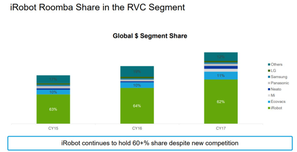 从 2018 年的财务报告来看,iRobot 在当时的市场表现依旧亮眼。过去三年中,它在全球扫地机器人(RVC)市场的营收占有率始终保持在 60% 左右。在那个时间点,iRobot 依然是毫无争议的行业第一,其份额甚至超过所有主要竞争对手的总和。